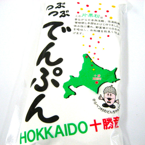 十勝の馬鈴薯を原料に、昔ながらの自然沈殿法によって分級した大粒子でんぷんを、低温長時間乾燥して作った、つぶつぶ片栗粉。