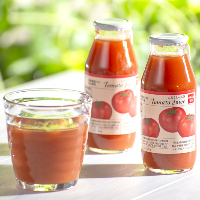 北海道下川町の樹の上で真っ赤に育ったトマト桃太郎を使用したのトマトジュース「ふるさとの元気」は、樹の上で真っ赤になるなで育った生食品種「桃太郎」と「宗谷の塩」だけで製造している、100%果汁のトマトジュースです。