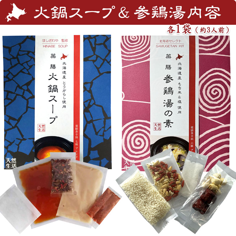 ご家庭で簡単に7種類の薬膳スパイス配合の「薬膳火鍋」が楽しめる火鍋の素と6種類の薬膳スパイス配合の「参鶏湯(サムゲタン)の素」(約3人前)各1袋セットです。