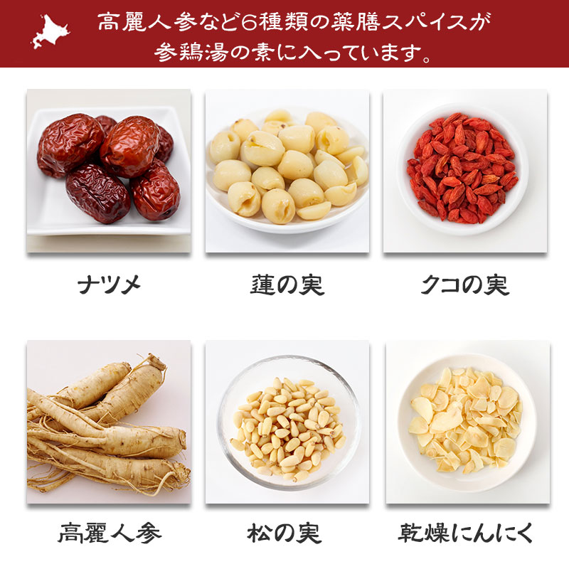鶏肉や野菜・きのこなどを加えオホーツク塩で、仕上げの味付けをして出来上がりご家庭で本格的なサムゲタンを楽しめるキットです。